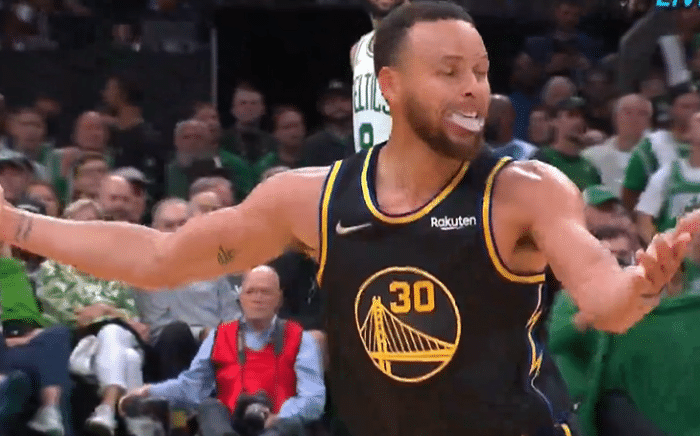 直接回到这两次极具争议的三分球。第一球,库里推进后直接出手三分。此时,凯尔特人球员在身后干扰,似乎有犯规嫌疑。库里在身体倾斜的情况下,强行将球命中篮筐。库里摊手向裁判投诉,但没有结果。很快,库里又在进攻回合中,距离三分线两步直接出手三分再中!这球,身后的塔图姆刹车不及,明显侵犯了库里。