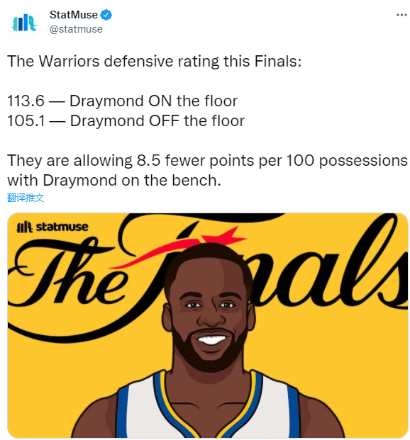 据统计,在今年总决赛上,格林在场时勇士防守效率是113.6,格林不在场时勇士防守效率是105.1,当格林坐在替补席时,勇士每100个回合的失分减少8.5分;今年总决赛格林作为主要防守人每回合丢1.24分,为其个人自2013-14赛季以来单轮季后赛系列赛最差。