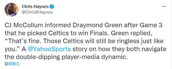 据名记海耶斯报道,总决赛G3赛后CJ-麦科勒姆告诉格林,凯尔特人将会赢得总决赛,格林回应:没关系,凯尔特人将会和你一样没有总冠军戒指。