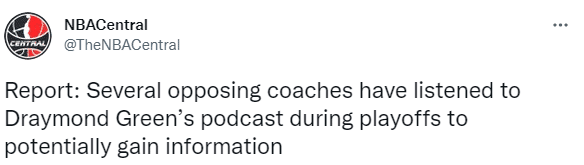 24直播网06月10日讯 ,总决赛三场战罢,勇士总比分1-2落后凯尔特人,库里场均30+表现出色,但德拉蒙德-格林的表现很不好,输球后继续做播客引发巨大争议,据美媒爆料,几位对手的教练在季后赛期间收听格林的播客,从而获取潜在的信息。