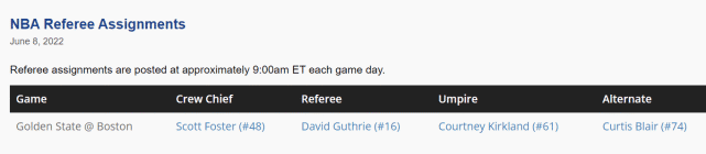 24直播网06月09日讯 ,NBA官方公布了总决赛G3的裁判名单,他们分别是48号裁判斯科特-福斯特,16号裁判大卫-古斯里,61号裁判 考特尼-科克兰德,替补裁判是74号裁判柯蒂斯-布莱尔。