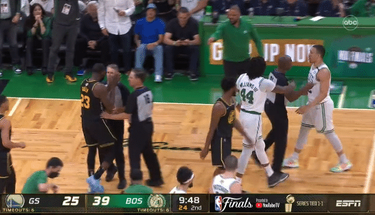 24直播网06月09日讯 ,勇士和凯尔特人总决赛G3,第二节场上险些发生冲突,格林和格威互喷垃圾话,所幸及时被劝阻拉开,双方都没有吃到技术犯规,这比赛打得真是火药味十足。
