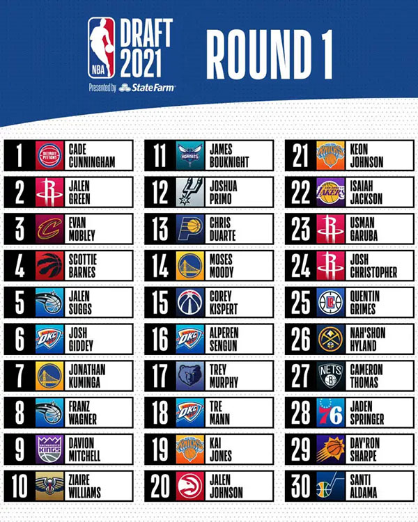 2021年NBA选秀首轮名单一览: