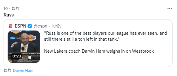 哈姆盛赞威少的言论冲上推特热搜引热议。