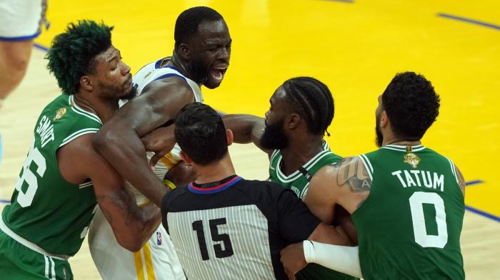 总决赛G2,勇士和凯尔特人两队球员之间的身体接触很激烈,尤其是格林,他不仅和格威、斯玛特抱摔,而且险些和布朗打起来;目前两队打成1-1平,系列赛至少再打3场,若格林不能控制情绪,恐怕他会继续吃T,甚至面临禁赛的风险。