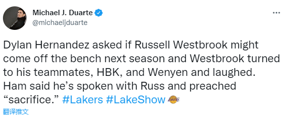 今日湖人新帅哈姆透露他已经和威少聊过了,直言威少是联盟历史上最出色的球员之一,与此同时,哈姆希望威少能在新赛季做出牺牲并且打出总冠军级别的防守。