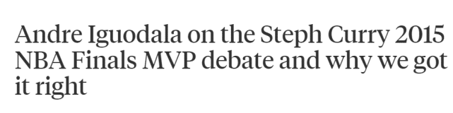 库里虽然在那轮系列赛场均26分6.3助攻5.2篮板,投篮命中率44.3%,三分命中率38.5%,但他没有得到任何一张票。库里三次夺冠都没有得到FMVP,也让他的历史地位引起争议。伊戈达拉表示,他认为库里确实应该获得一座FMVP奖杯,但他不认为2015年记者们选错了人。