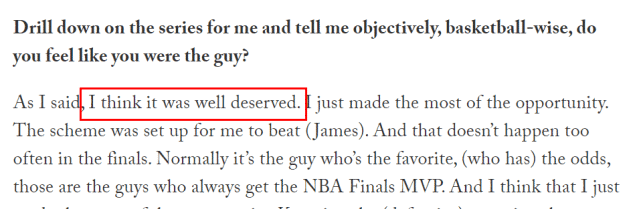 “就像我说的,我认为这是当之无愧的,”谈到自己2015年的总决赛MVP奖项我,伊戈达拉说道,“我只是充分利用了这次机会。这个计划是为了让我打败(詹姆斯)。这在总决赛中并不常见。通常情况下,谁是赔率方面最被看好的人,谁就最有机会得到总决赛MVP。”
