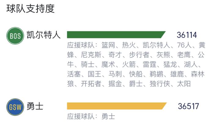 不过勇士球迷们还是很多的,虽然数量对比上是1-29落后,但在具体的票数上,看好勇士在G2取得胜利的球迷多达36517,而支持凯尔特人的是36114,力挺勇士的票数要明显更高一些。