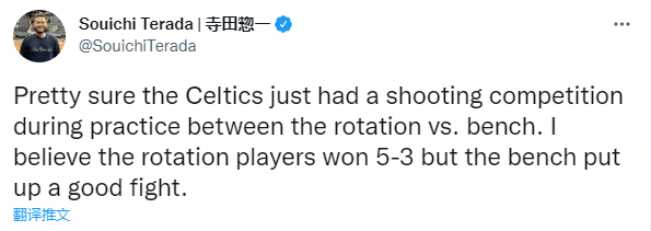 凯尔特人全队也在大通中心进行训练,塔图姆、布朗等球员加练三分球的现场画面曝光;据绿军跟队记者Souichi Terada报道,刚刚绿军的轮换球员和板凳球员之间进行了一次投篮比赛,轮换球员最终以5-3获胜,但板凳球员也表现很不错。