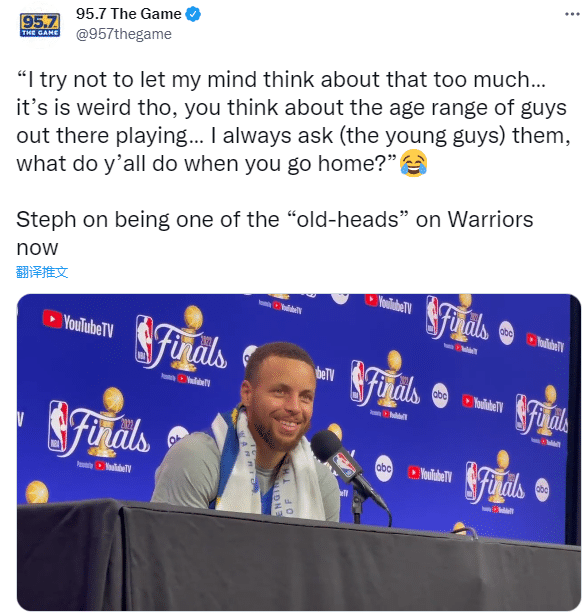 谈到自己是否是球队的“老头”,汤普森一口回绝,表示:从人生的大局来看,32 岁还很年轻;对于这样的问题,库里先是露出笑容,然后表示:我试着不让自己想太多,这感觉很奇怪。