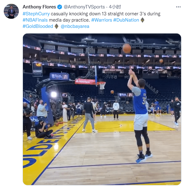 在勇士全队公开训练时,美记者Anthony Flores晒出库里备战总决赛的现场画面,在训练师的帮助下,库里在底角附近连续投进13记三分,各种急停撤步三分太神准;库里第14次出手不进的原因是他的球砸到了队友的篮球上,否则他可能延续连中。