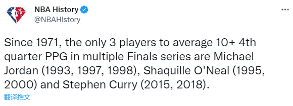 库里拥有总决赛纪录——据NBA官方统计,自1971年以来,仅有三位球星在多次总决赛第四节打出场均得分10+的表现,分别是乔丹(1993、1997、1998),奥尼尔(1995、2000)和库里(2015、2018);库里比肩乔丹和奥尼尔成NBA近51年第3人。