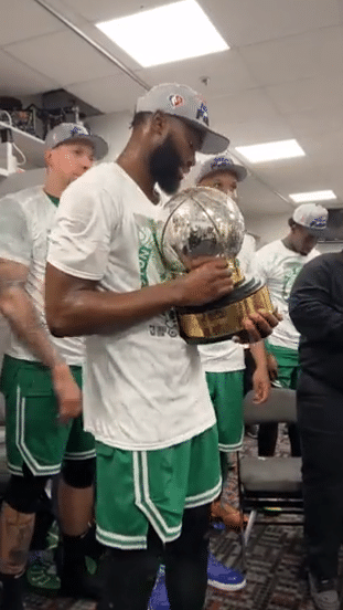 24直播网05月30日讯 ,凯尔特人拿下东决G7,系列赛大比分4-3淘汰热火从而夺得东部冠军,时隔12年重返总决赛,赛后全队在更衣室疯狂庆祝曝光,全队爆粗口泼水庆祝,塔图姆站在椅子上,全程抱着东决MVP奖杯,一脸笑容太开心。