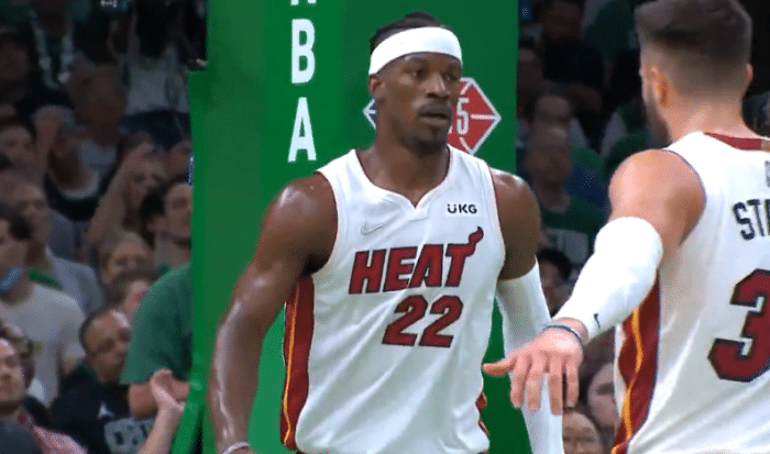 G4和G5输球,巴特勒因受到膝伤的困扰而表现十分糟糕,G6生死战,巴特勒演绎王者归来,首节打满12分钟,10投6中轰下14分5篮板4助攻2盖帽,全队29分有24分和巴特勒有直接关系;巴特勒多次杀到禁区强硬得分,外线三分也早早开张,抢断反击并且助攻队友暴扣。