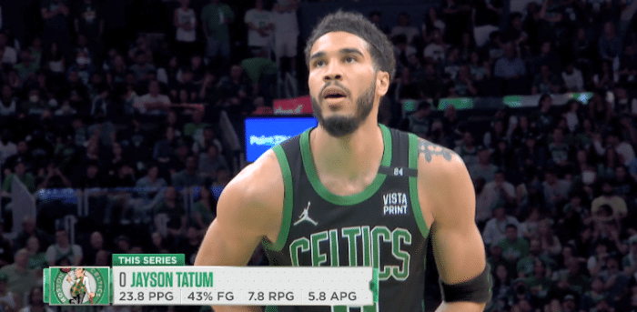 第二节,两队2分钟没有得分,塔图姆造犯规两罚全中,为凯尔特人追分,塔克的三分出手命中,塔图姆的三分还击,拿到了12分。巴特勒跳投不进,塔图姆又是连续拿到了4分,个人第二节拿到了9分,追到31比32只差1分,塔图姆16分。暂停后,巴特勒三分命中,自己造犯规两罚全中,37比31领先。