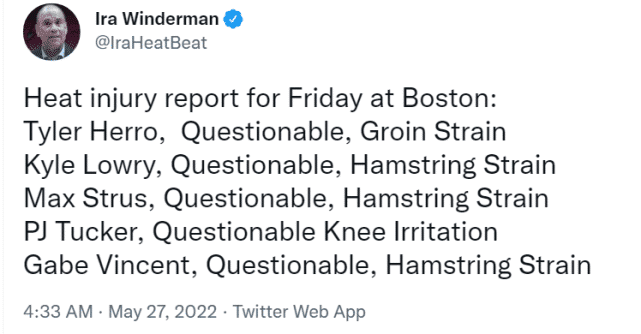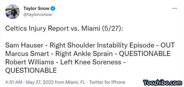 24直播网05月27日讯,热火和凯尔特人公布了东决G6的最新伤情。绿军方面,斯马特(右踝扭伤)和罗伯特-威廉姆斯(左膝酸痛)被列为出战成疑,豪瑟(右肩伤病)继续缺阵;热火方面,希罗(腹股沟拉伤)、塔克(膝盖伤病)、洛瑞(腿筋拉伤)、斯特鲁斯(腿筋拉伤)、文森特(腿筋拉伤)都是出战成疑。塔图姆和巴特勒都不在伤病名单上,确定出战G6,但两人都是带伤作战,塔图姆肩膀有问题,巴特勒的膝盖也有伤。