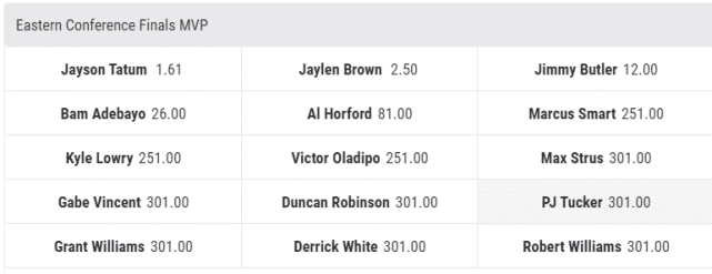 如果绿军最终晋级总决赛,那么首届东决MVP奖项的归属将成为一大悬念。目前处于领跑位置的是双探花,而且两人相差不大。塔图姆拿下东决MVP的概率是1.61,布朗是2.50,巴特勒排名第三,只有12.00。东决至今,塔图姆场均23.8分7.8篮板5.8助攻,投篮命中率42.9%,三分命中率27%;布朗场均25分7.6篮板2助攻,投篮命中率48.4%,三分命中率43.6%。