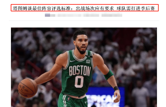 塔图姆在接受采访时谈到了最佳阵容评选,他认为最佳阵容评选规则有问题,不应该有位置人数限制,而恩比德只拿到最佳二阵完全没有道理。接着,塔图姆还表示,联盟还应该制定规则,只有带队打进季后赛的球员,才有资格评选最佳阵容。