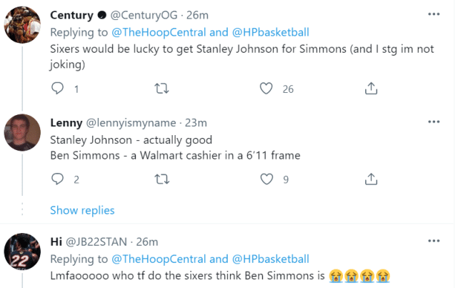 即便如此,球迷们依然认为费城在狮子大开口要价。有球迷晒出一张詹姆斯效力热火时的照片,并调侃这就是费城眼中的西蒙斯。有猛龙球迷表示就算是只出斯坦利-约翰逊,他们都不想要西蒙斯:约翰逊还算不错,而西蒙斯只是一个6尺11身高的收银员。还有球迷哭笑不得,认为费城在做白日梦:“他们把西蒙斯当成什么宝了?”