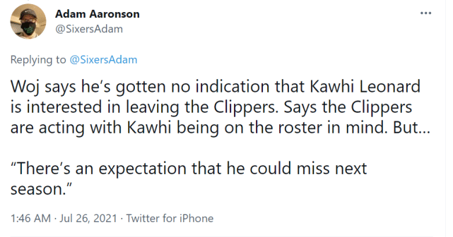 24直播网讯 北京时间7月26日,ESPN名记沃纳罗斯基在最新一期节目上透露,科怀-莱昂纳德没有兴趣离开快船,快船的运作也是按照小卡会留在阵中进行的。不过,沃纳罗斯基也表示,小卡预计会缺席下个赛季。换言之,2021-22赛季,小卡很可能因伤赛季报销。