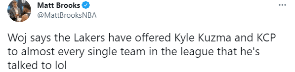 24直播网讯 北京时间7月26日,据名记shams报道,湖人已经公开交易库兹马和波普,他们不仅疯狂争抢洛瑞,而且已经和国王商讨关于希尔德的交易,还追求德罗赞、丁威迪等人;湖人锁定多个目标,积极交易库兹马、波普等球员,不得不说疯狂的休赛期来了。