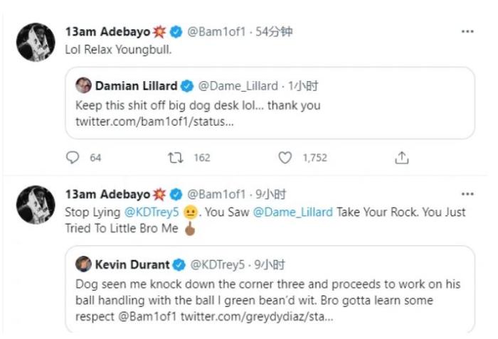 很快,阿德巴约在社交媒体上还原了真相,并且进行了回击,阿德巴约表示:别在那里撒谎了,你都看到了,是利拉德拿走了你的球,你就会在哪里以大欺小,为了表示自己的愤怒,阿德巴约还配上了一个“竖中指”的表情包。