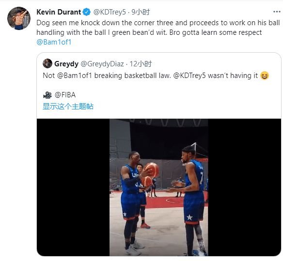 作为社交达人,杜兰特怎么可能丢掉网络的阵地,很快杜兰特转发了这条社交动态并表示,这哥们看到我进了一个三分,但是拿到球的他却不理我(按照波波维奇的规则,进球的球员可以继续投篮),他继续埋头运球,让我有点生气了,他应该学会尊重别人。
