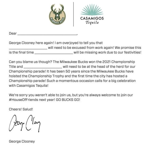 由于庆典安排在工作日进行,雄鹿官方也细心为球迷们准备了请假信模板,希望老板们能够批准大家都加入到这阔别50年的狂欢中,这不容错过。官方提示球迷们还可以参加线上活动,有机会获得总冠军帽子和T恤。
