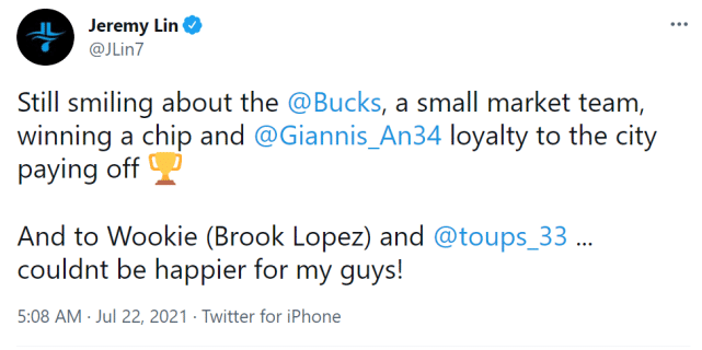 雄鹿的夺冠,是小市场球队的罕见胜利,收到了各界的祝福。林书豪也更推写道:“仍在为雄鹿夺冠感到开心,一支小市场球队最终夺冠,字母哥的忠诚得到回报,为我的兄弟洛佩斯和唐佩恩感到开心。”