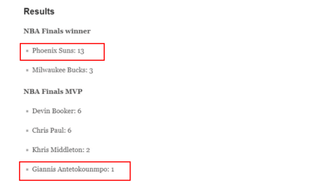 最终,16位专家中只有德保拉和弗里德尔的预测正确,雄鹿4-2拿到了总冠军。关于总决赛MVP的归属,当时16位专家中的15人也给出了预测,6人预测布克拿到这个奖杯,6人预测保罗拿到这个奖杯。在看好雄鹿夺冠的3位专家中,2人看好米德尔顿拿到FMVP奖杯,只有1人支持字母哥当选FMVP。字母哥在总决赛前的不确定伤情,影响了专家们的预测。