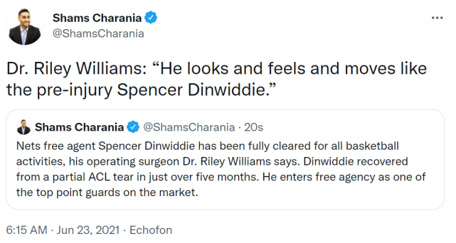 查拉尼亚表示,丁威迪只有了5个月的时间就从十字韧带部分撕裂的伤势中康复,他将成为今年夏天自由球员市场上的顶级控卫。丁威迪本人第一时间转发了查拉尼亚的报道,并补充写道:“5.5个月。”
