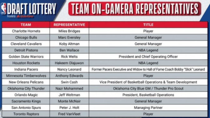 乐透区第5-14名:公牛(归魔术)、雷霆、森林狼(归勇士)、魔术、国王、鹈鹕、黄蜂、马刺、步行者、勇士。