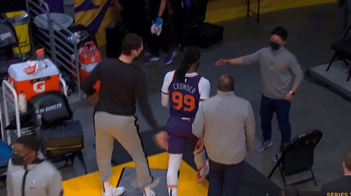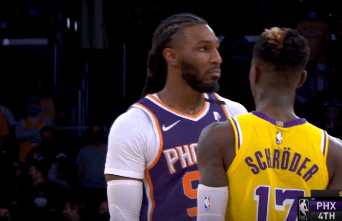 只不过在第四节最后时刻发生了一些小插曲,比赛失去悬念基本无法扭转时,布克在防守中强行推了一把施罗德,导致对手倒地,好在小黑并无大碍,还在起身前连续做了几个俯卧撑动作,最终布克被判罚二级恶意犯规被驱逐!克劳德则是因为喷垃圾话领到第二个T,被驱逐出场!