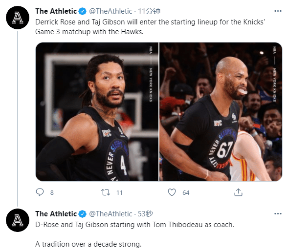 锡伯杜执教尼克斯,罗斯和吉布森都首发上场,这有点昔日公牛的感觉,对此美媒The Athletic发推写道:十多年的传统。