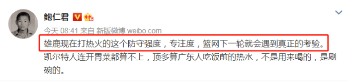 而国内记者鲍仁君老师在社媒上发文,他认为篮网要遇到一定的麻烦,将接受真正的考验。“雄鹿现在打热火这个防守强度,专注度,篮网下一轮会遇到真正的考验,凯尔特人连开胃菜都算不上,顶多算是吃饭前的热水,不是用来喝的,是刷碗的”。