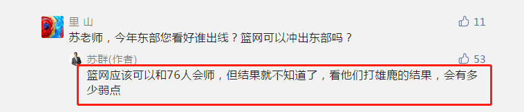 有球迷提问,篮网今年可以冲出东部吗?而苏群老师的回答很直接,篮网应该会和费城相遇东决,但具体能否击败费城进总决赛,这就不知道了,需要看篮网打雄鹿,还暴露出多少弱点。