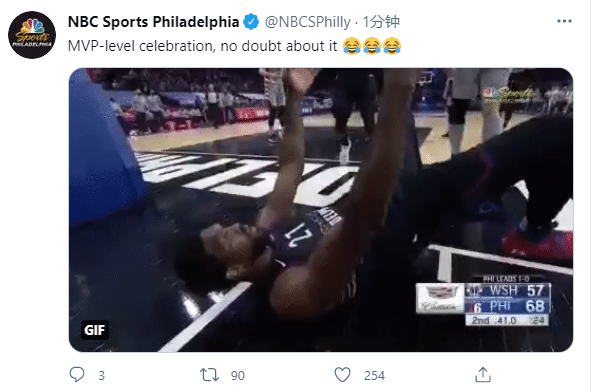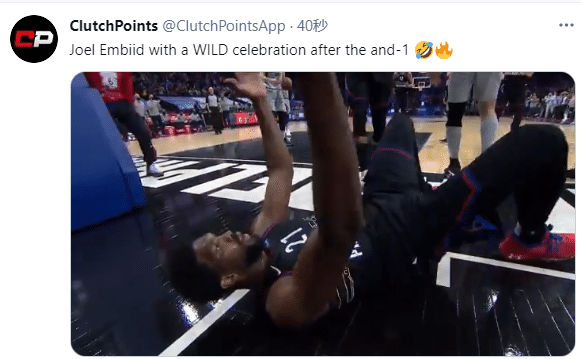 恩比德疯狂庆祝动作引热议,美媒ClutchPoints发推写道:恩比德狂野的庆祝;费城媒体则是写道:毫无疑问,MVP级别的庆祝姿势。