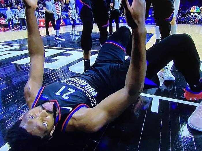 24直播网讯 北京时间5月27日,东部第一费城和奇才系列赛G2大战,比赛期间双帝连线,恩比德摔倒仍旧打成2+1,他倒地庆祝动作引热议,吐舌搞怪以及“狂秀好腰”庆祝,这姿势太辣眼睛,美媒直呼狂野以及MVP级庆祝。