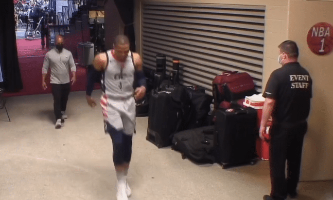 24直播网讯 北京时间5月27日,奇才和东部第一系列赛G2,场上多次出现受伤事件,末节威少脚踝受伤,一瘸一拐返回更衣室,离场时在球员通道入口处,威少被现场球迷激怒,情绪失控一副要揍人的样子,几个大汉才拦住他。