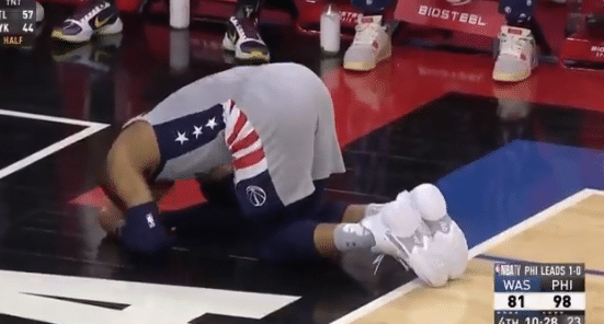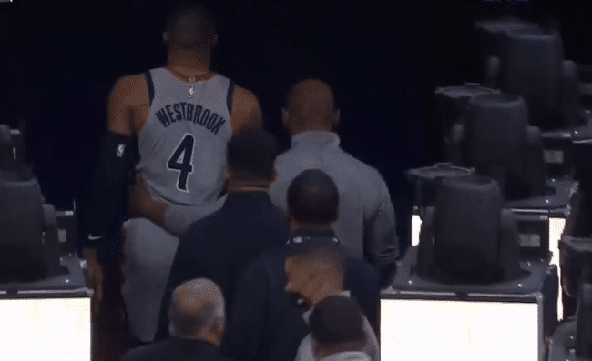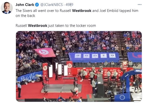 第四节10分28秒,威少持球进攻时踩到科尔克马兹,导致脚踝几乎呈90度扭伤,随后威少痛苦倒地,双膝跪地十分痛苦,心情沮丧怒吼咆哮;威少离场前,恩比德拍了拍他的后背。