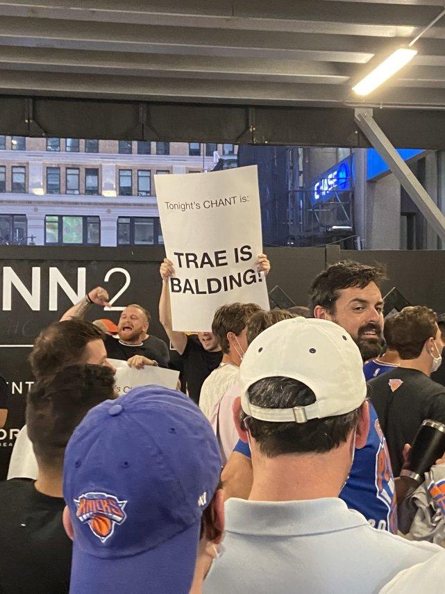5月27日,尼克斯和老鹰的G2即将开始,尼克斯的球迷也开始了精神层面的打击,赛前他们制作了标语嘲讽特雷杨22岁就秃顶的标语,不得不说,这样的标语攻击性不强,但是侮辱性极强。