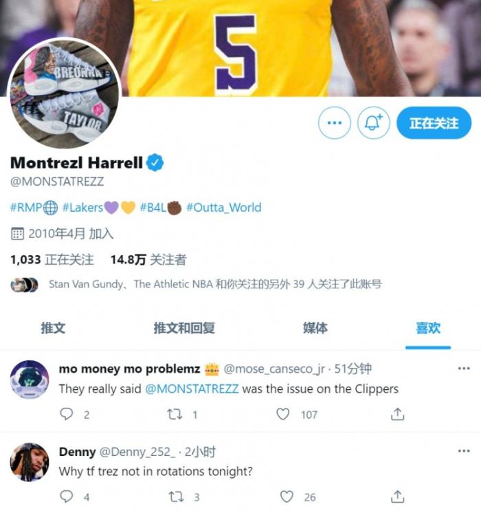 赛后,本场没有出场的湖人球员哈雷尔更新了推特。他写道:“