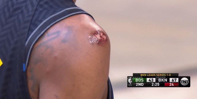 不过场上比分的悬殊,并不意味着比赛不激烈,相反,这场比赛的身体对抗随处可见。比如说比赛进行到第二节还剩下10分钟左右,杜兰特在突破时摔倒在地,弄伤了自己的右肩,当镜头特写给到了杜兰特的肩部时,这个伤口看起来还是很吓人的,不过杜兰特不会被这个伤口击倒,他坚持到半场结束才会到更衣室进行治疗。