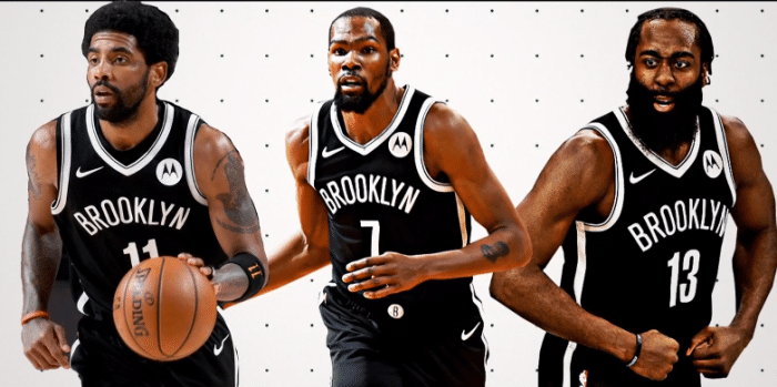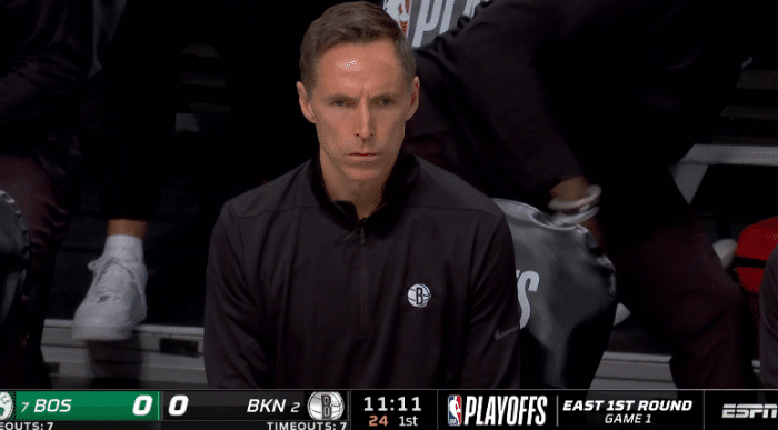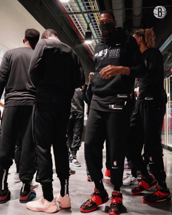 篮网首发阵容是杜兰特、哈登、欧文、格里芬和乔-哈里斯,纳什赛季首次派出这样的首发阵容,篮网三巨头季后赛首秀,也是三巨头本赛季第9次一起出战。