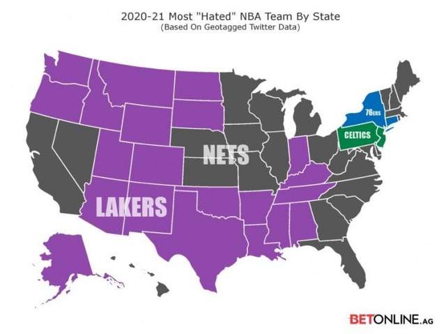 24直播网讯北京时间5月22日,有媒体发布了4月份NBA仇恨值最高的球队,他们利用网络上的相关推文得出结论。布鲁克林篮网是4月份NBA仇恨值最高的球队,湖人队则排在第二。凯尔特人和76人分别排在第三和第四。