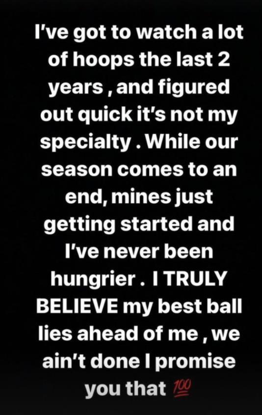 这赛季算成功吗?至少从科尔库里赛后的话能听出他们是满意的,而赛季报销的克莱则是连发社媒安慰队友并霸气摊牌“过去两年里我观看了太多的比赛,很快明白这不是我的专长。当我们的赛季走到尾声,我的赛季才刚刚开始。我从未感到如此饥渴,我坚信我最好的比赛还在前面等着我。我向你们保证,我们还没有落幕”