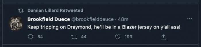有趣的是,赛后推特上一名网友发推说到:“继续贬踩追梦吧!他总有一天会穿上开拓者的球衣的!”利拉德进行了转发,这是开始挖人了?就在昨天,人们还在热议利拉德喷追梦,与湖人比赛中追梦手指戳到老詹眼睛,利拉德发推“他就是个混蛋”但随后又解释“我是在称赞他的防守,你们根本不懂”