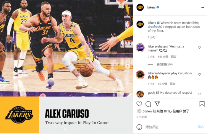 24直播网讯湖人官方晒出卡鲁索在附加赛中的表现,配文:当球队需要他的时候,卡鲁索在攻防两端都表现很好;对此詹姆斯转发并且盛赞小弟:历史最佳。