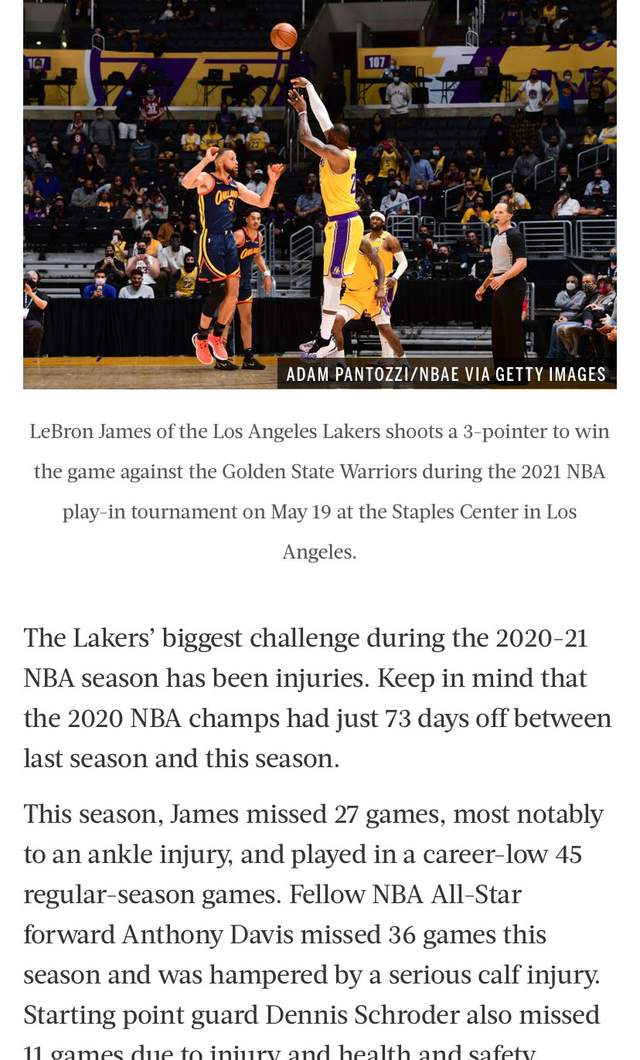 本赛季对于詹姆斯来说无疑是十分艰难的一个赛季,尽管他们上赛季刚刚拿到了总冠军,不过队内阵容仍然发生了很大的变化。隆多、霍华德等悍将的离开,施罗德和庄神等人的加盟都让这支球队的化学反应发生了改变。当然更重要的是詹姆斯和浓眉哥本赛季都因伤缺席了很长时间,浓眉哥尚且恢复到了最佳状态,但詹姆斯在距离赛季结束还剩下两场比赛的时候才正式复出,也不知道他的伤病痊愈了没有。